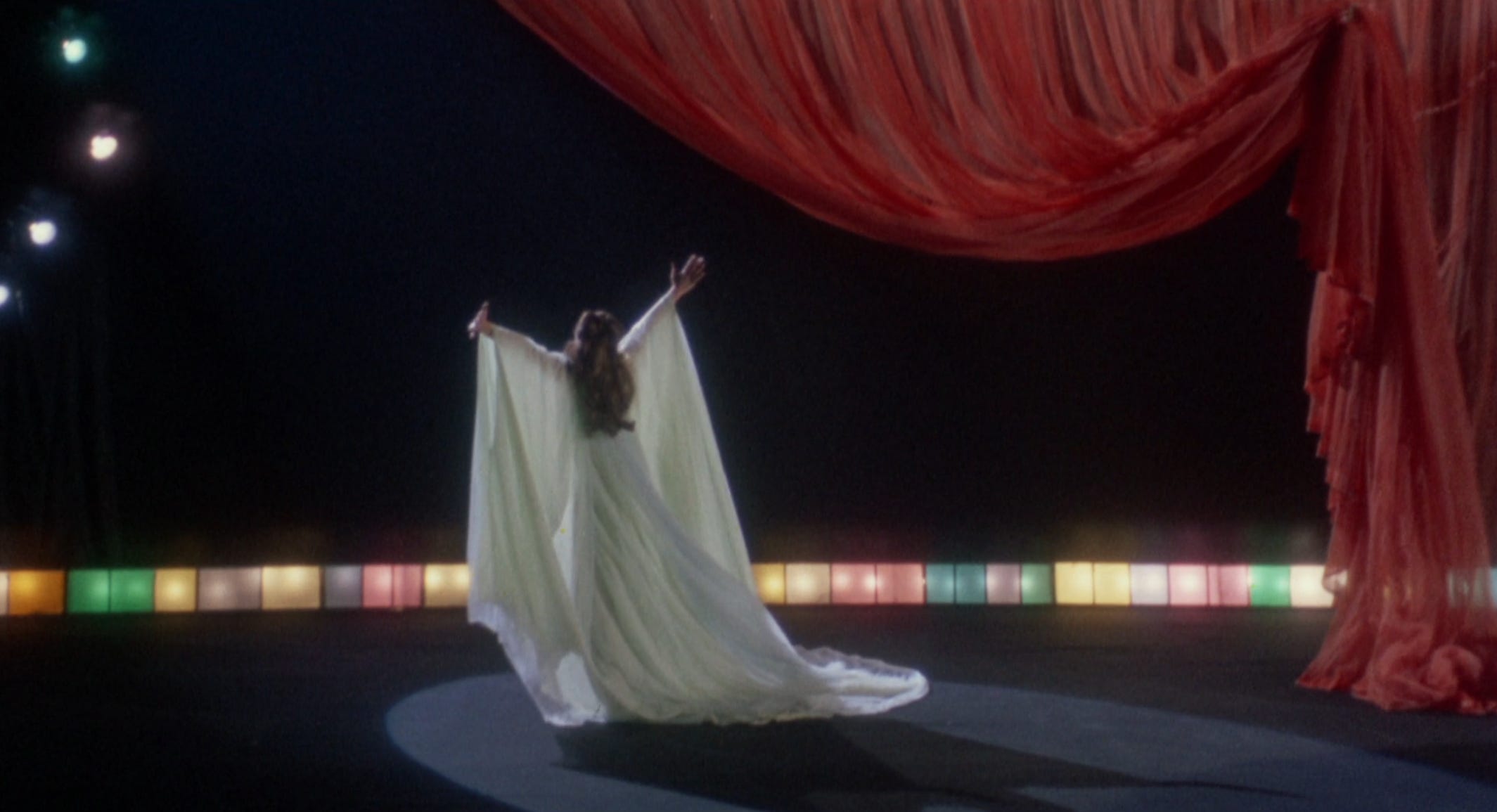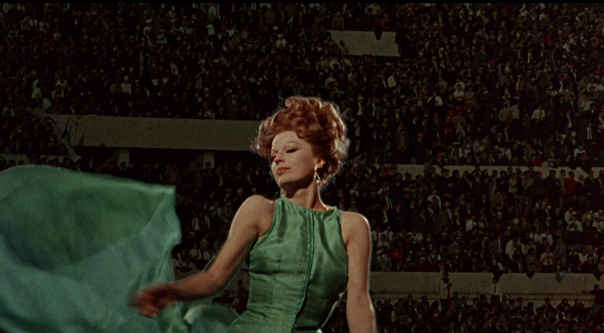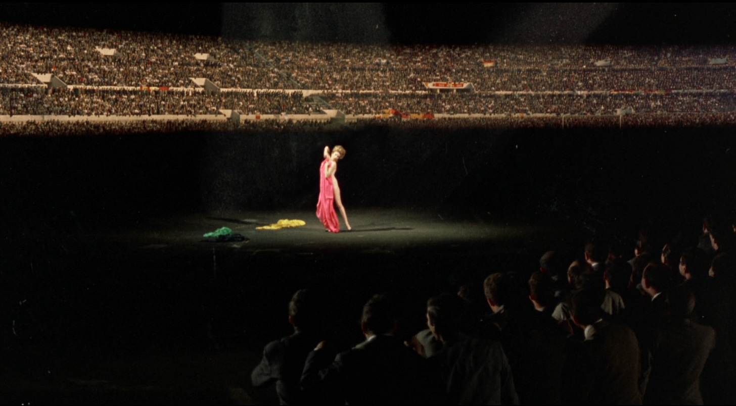 As the film winds down she makes her way to a coliseum, wearing a multi layered satin gown that references the many sides of her. They read as the flag a matador holds as the men follow her in the streets loudly. At the center of the stadium she is bathed in a single light and she is finally the center of attention. The feeling that she craves from one man, she is getting from many. She strips off each layer to the delight of the crowd until there are none left.