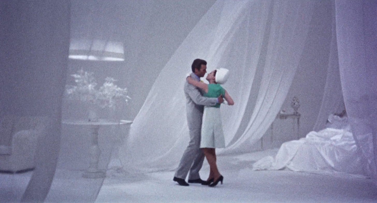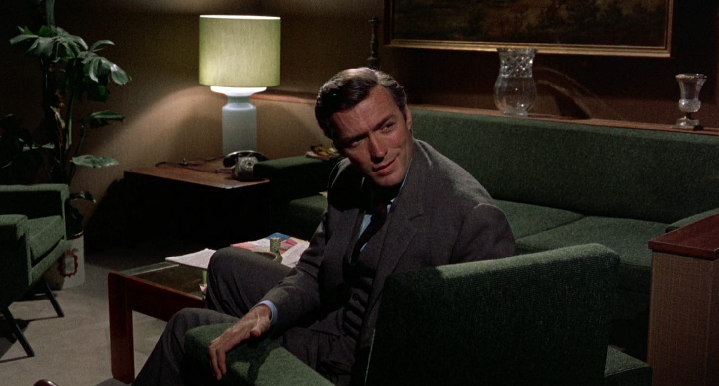 Clint Eastwood plays Carlo, Mangano's husband, a man cut out of the pages of 60s Esquire: manicured, aloof, and the epitome of masculinity. Mangano plays Giovanna, a doting if not irritated housewife who longs for more emotion and passion from him. Their well-curated home is not enough and these satin sheets won't rumple themselves. She reminisces of the early stages of their marriage and the director cuts to a white room in soft focus (reminiscent of Ann Margaret’s room in Ken Russel’s Tommy) where they consume one another passionately. Carlo actually leaps into bed with her at the start but over time their embraces grow colder and she feels more alone, wanting to be desired again. If not by him, by someone.