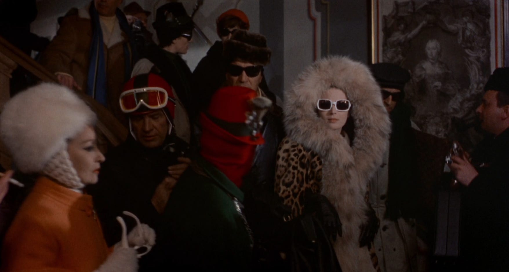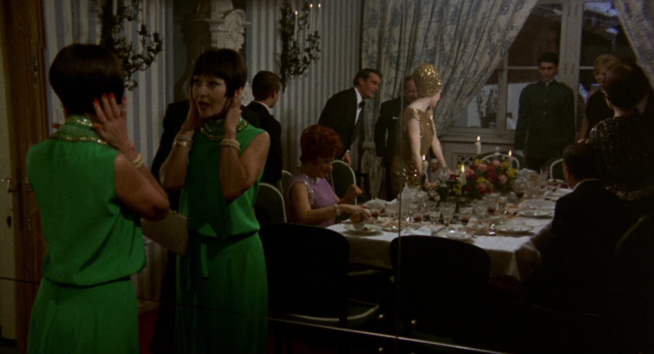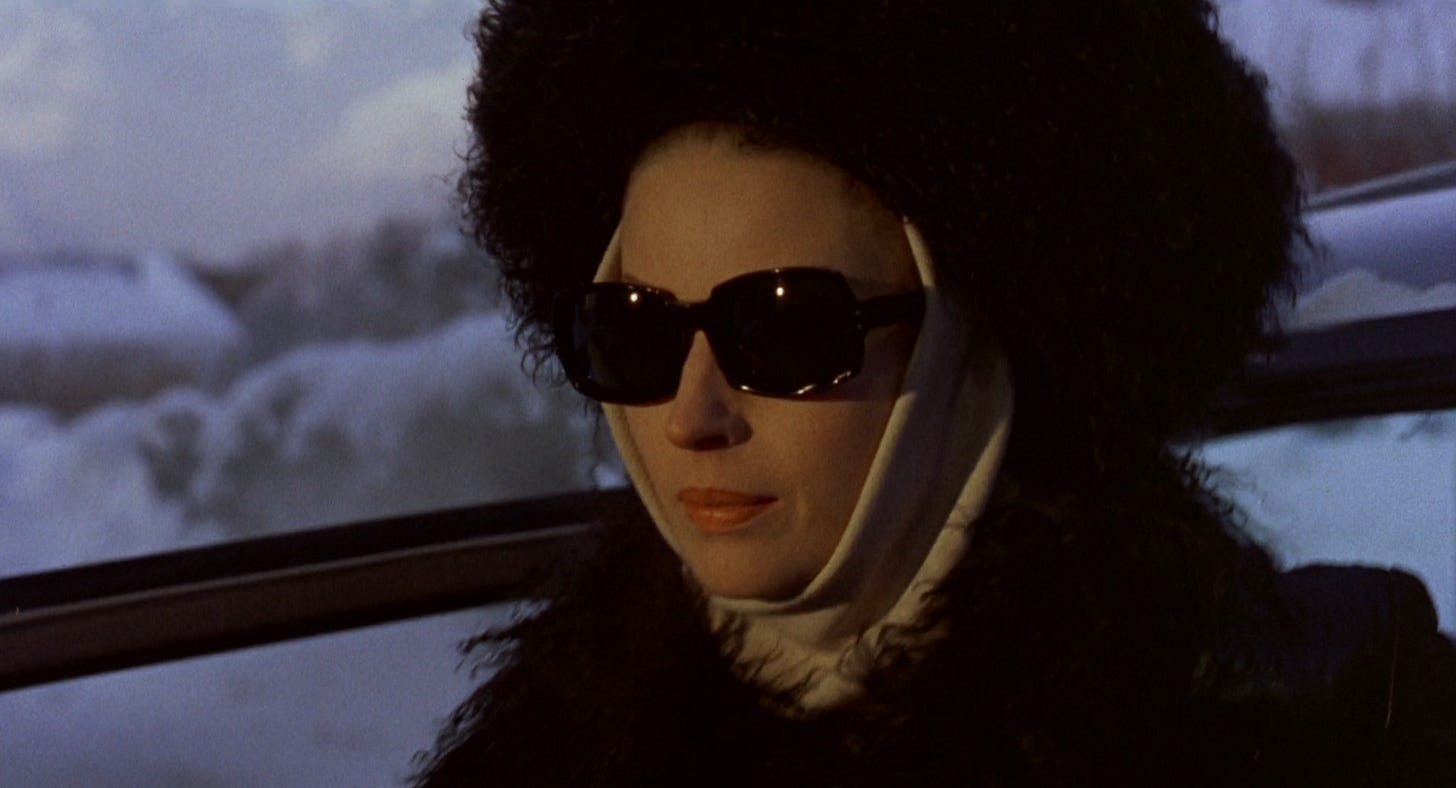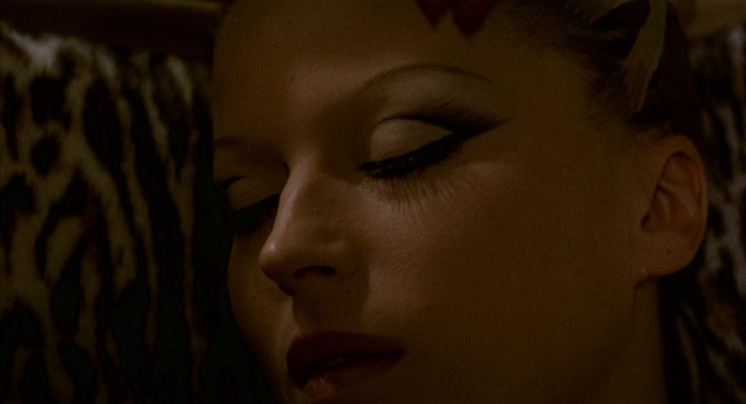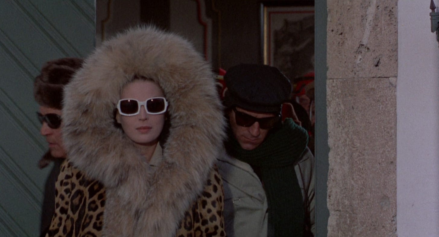In the opener The Witch Burned Alive by Luchino Visconti, a famous actress makes what feels like a paid appearance at a friend's party. She quips to the host, "I couldn't miss the tenth anniversary of your husband's infidelity!" and her arrival leaves the guests speechless, then filled with gossipy theories. Things take a turn when she unexpectedly falls ill and everyone starts picking apart her appearance and peeling away her layers (literally removing her lashes) while she writhes in and out of consciousness. They treat her like an alien carcass they discovered on the side of the road, poking and prodding her with a mix curiously and with underlying revulsion. What makes HER so special? They all seem to be wondering. She somehow gains her footing again and is able to leave with her dignity, via helicopter, hidden behind sunglasses and a big fabulous designer coat. You can’t keep a good girl down.